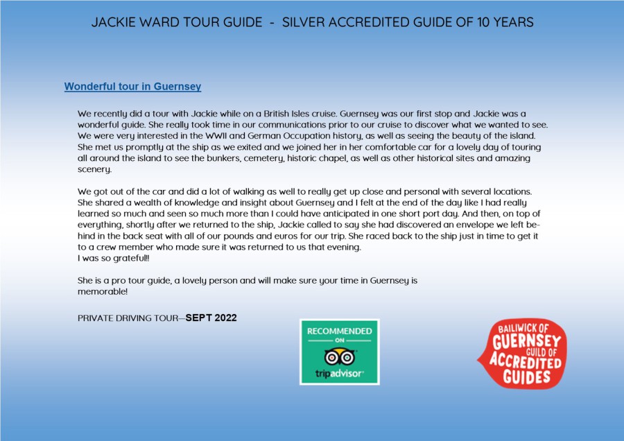 2022: I was excited to be approached by descendants of Guernsey emigrants...we had such fun finding the ancestral home and some tombs to pay a tribute to. As it says on this testamonial, I am not a geneologist and I can't promise to have the time to put a lot of research in advance of a tour. The information you have the more we can get out of a short visit.